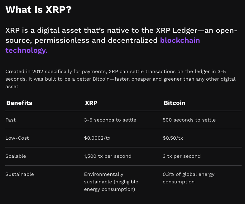 “Ripple is a technology company that makes it easier to build a high-performance, global payments business. XRP is a digital asset independent of this.”
